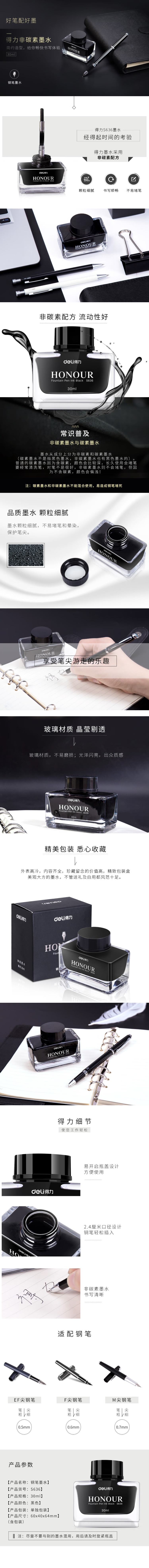 商品属性 [供应商] 全程速达科技有限公司 [名称] 内容 [品牌:] 得力(deli) [商品名称:] 钢笔墨水 非碳素 [型号:] S636
