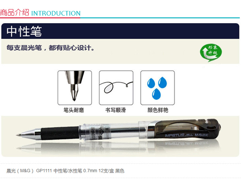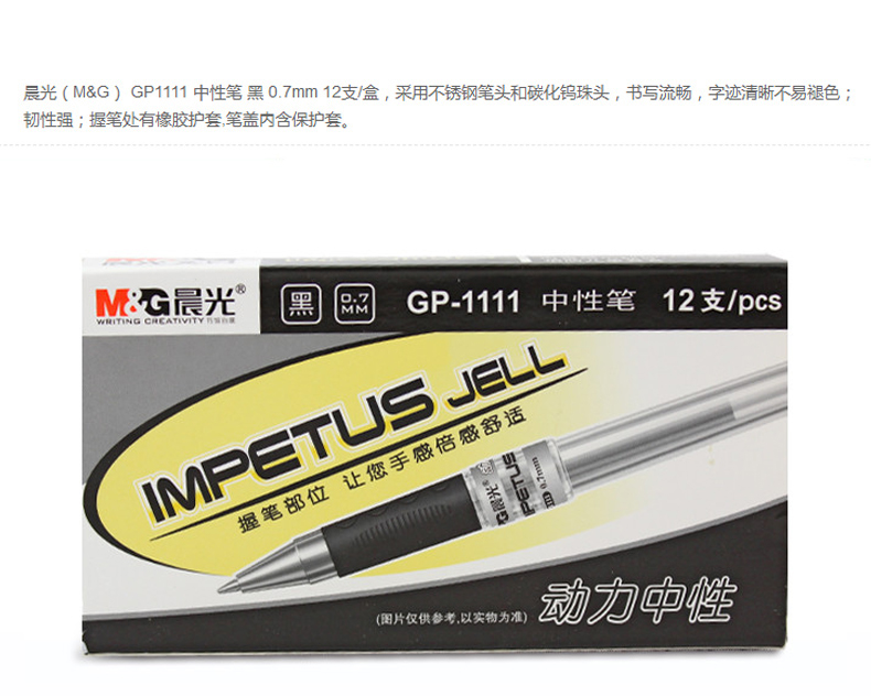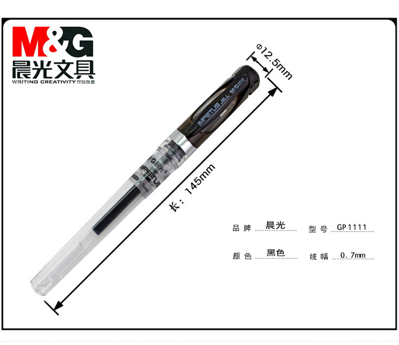 商品属性 [供应商] 科力普科技集团股份有限公司 [笔芯颜色] 黑色 [打开方式] 拔帽式 [适用替芯] 笔芯型号:MG-6128 [入数] 1支 [笔尖粗细] 0.7mm [品牌] 晨光 [型号] GP-1111 [内包装] 12支/盒