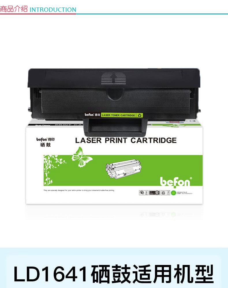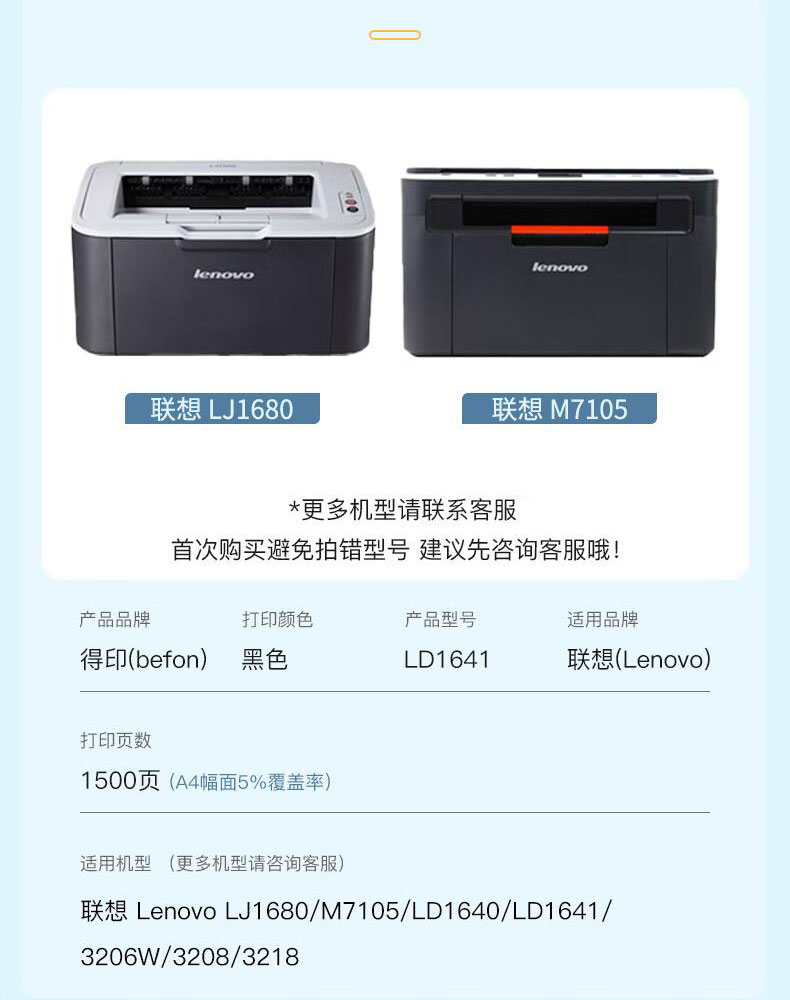 商品属性 [供应商] 科力普科技集团股份有限公司 [打印量] 1500页 [适用机型] 联想 Lenovo LJ1680/M7105/LD1640/LD1641/ 3206W/3208/3218 [商品毛重] 785克 [品牌] 得印