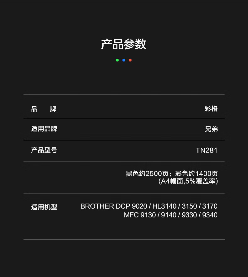 商品属性 [供应商] 德致商成集团有限公司 [商品毛重] 0.55kg [打印页数] 1400 [类型] 通用耗材 [适用机型] 兄弟HL3170CDW DCP9020 9140 TN-285 HL-3140 3150cdn MFC9130 9330 9340粉盒