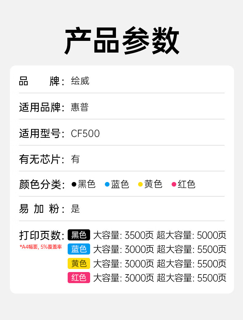 商品属性 [供应商] 深圳市怡亚通供应链股份有限公司 [品牌:] 绘威 [型号:] CF500X [规格:] 打印页数:12500页