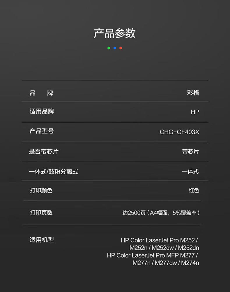 商品属性 [供应商] 德致商成集团有限公司 [打印页数] 2500页 [原装/通用] 通用耗材 [包装清单] MAX版红色硒鼓(1支) [类别] 一体式硒鼓 [适用机型] 适用惠普252dw硒鼓 252N M252DN M277DW M274n打印机