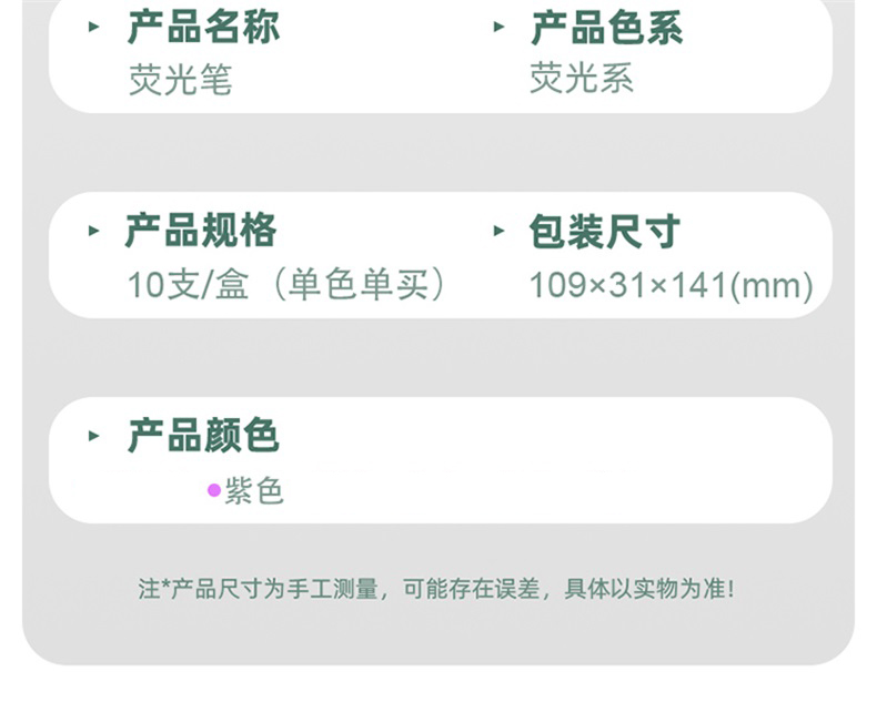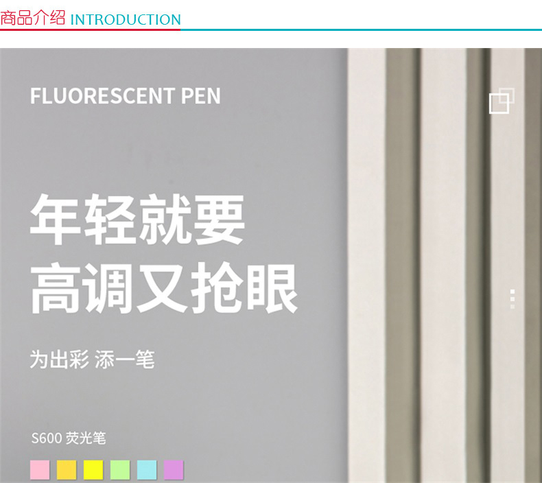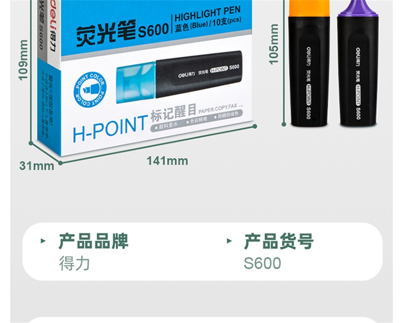 商品属性 [供应商] 科力普科技集团股份有限公司 [书写线幅] 5.0mm [入数] 1盒 [笔头形状] 斧形头 [笔头数量] 单头 [品牌] 得力 [型号] S600 [内包装] 10支/盒