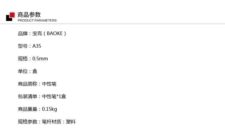 商品属性 [供应商] 深圳齐心集团股份有限公司 [品牌] 宝克(BAOKE) [型号] A35 [笔杆材质] 塑料