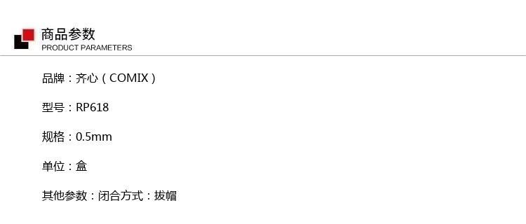 商品属性 [供应商] 深圳齐心集团股份有限公司 [品牌] 齐心(COMIX) [型号] RP618 [产品特性] 普通装 [闭合方式] 拔帽 [书写粗细] 0.5mm [笔芯颜色] 黑色
