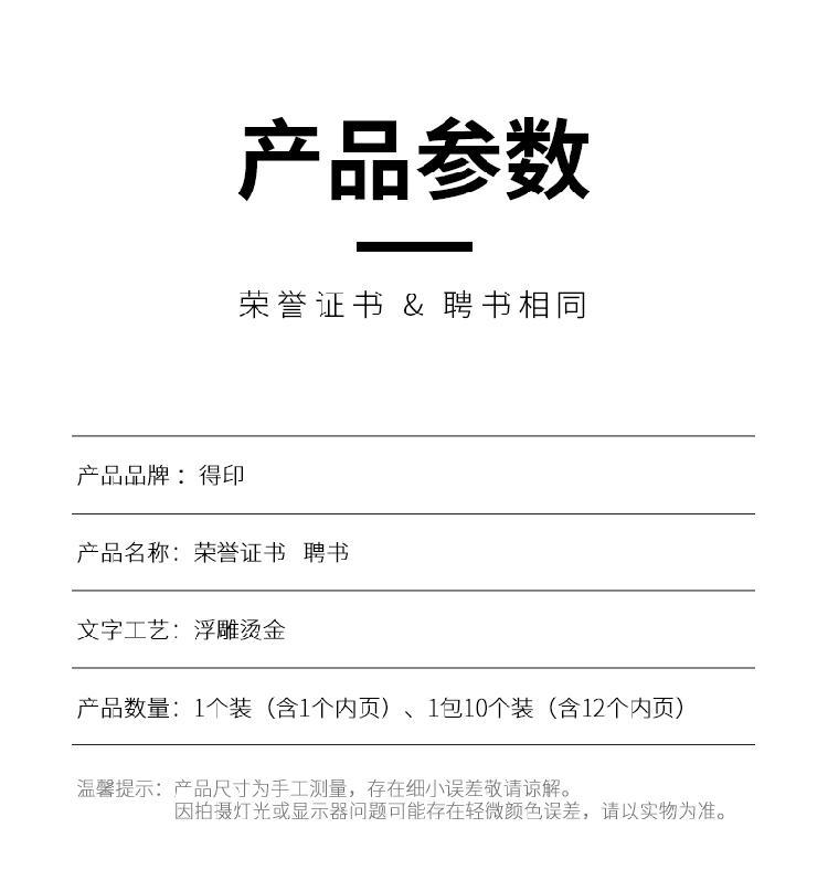 商品属性 [供应商] 深圳齐心集团股份有限公司 [品牌] 得印(befon) [型号] 2473 [适用场景] 职场 [页数] 1页 [内芯幅面规格] 12K [是否可定制] 否 [商品产地] 中国大陆 [类型] 奖状/证书