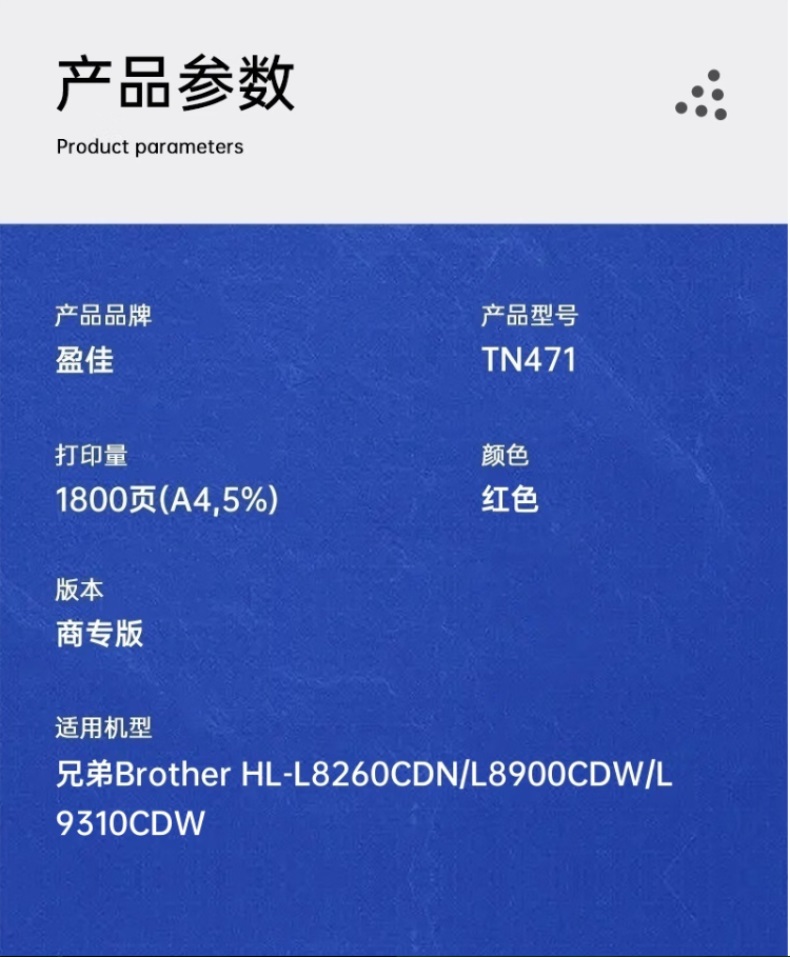 商品属性 [供应商] 科力普科技集团股份有限公司 [适用机型] 适用于兄弟Brother HL-L8260CDN L8900CDW L9310CDW MFC-L8690CDW [商品毛重] 420g [打印量] 1800页 [品牌] 盈佳 [型号] TN471