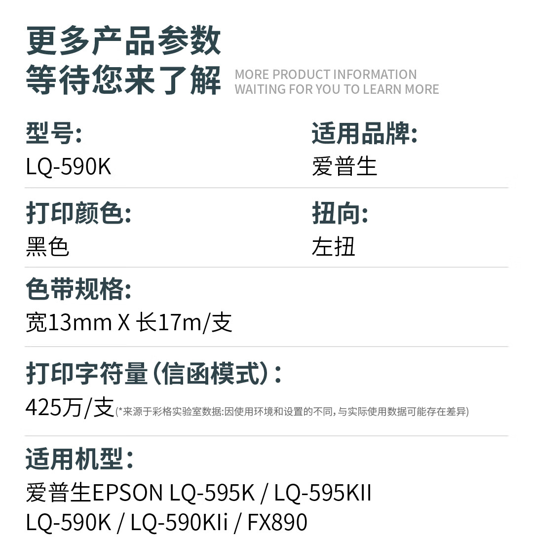 商品属性 [供应商] 德致商成集团有限公司 [国产/进口] 国产 [带架规格] 13mm*17m [支数] 10支 [打印颜色] 黑色 [商品产地] 中国大陆 [适用机型] 适用爱普生EPSON LQ-595KII针式打印机