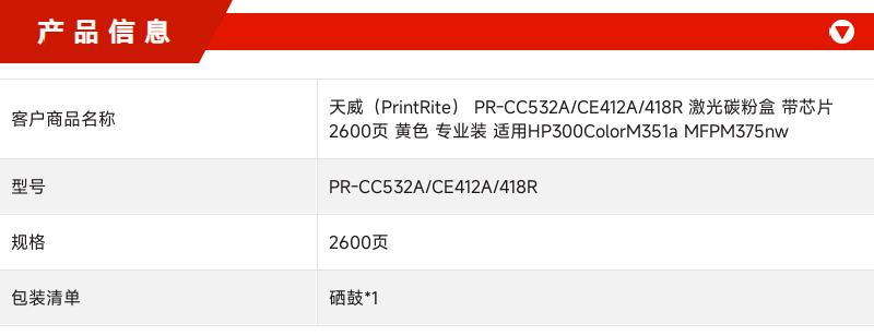 商品属性 [供应商] 史泰博(上海)有限公司 [品牌] 天威(PrintRite) [型号] PR-CC532A/CE412A/418R