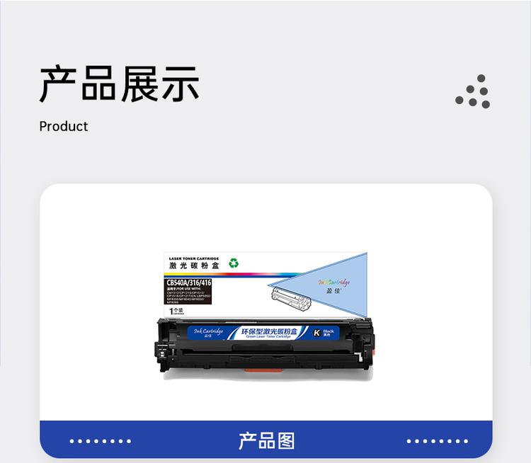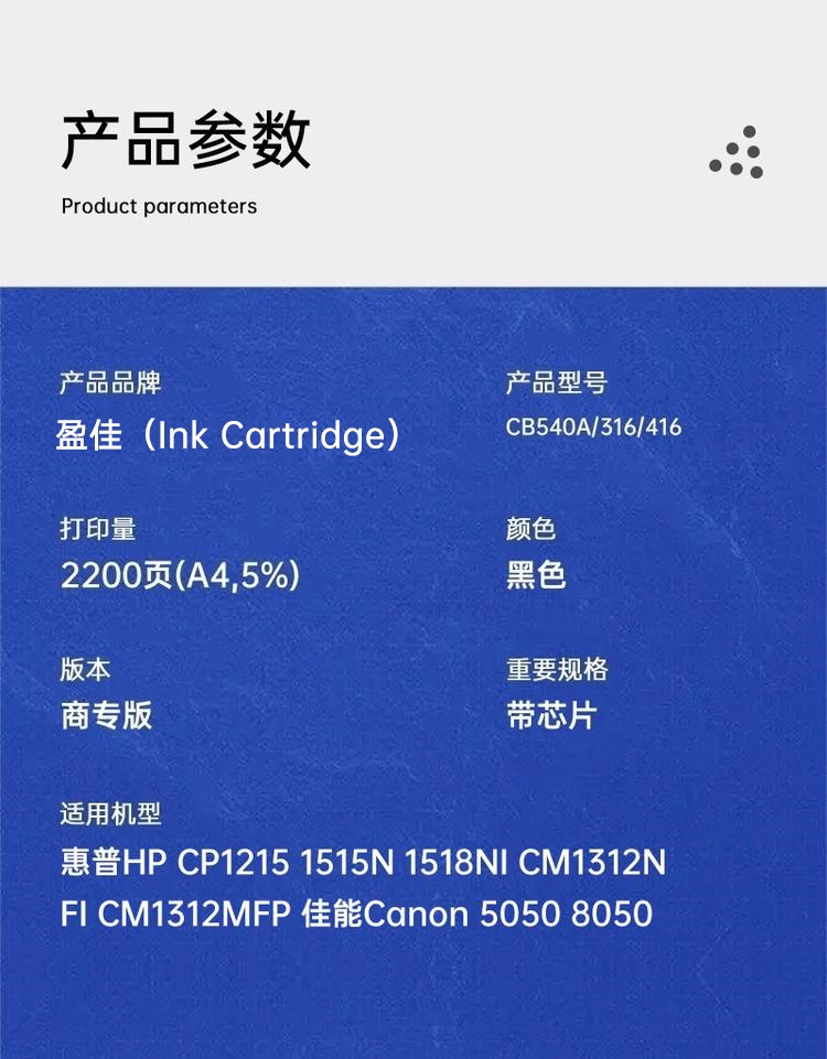 商品属性 [供应商] 深圳齐心集团股份有限公司 [品牌] 盈佳(Ink Cartridge) [型号] CB540A/316/416 [是否带芯片] 带芯片