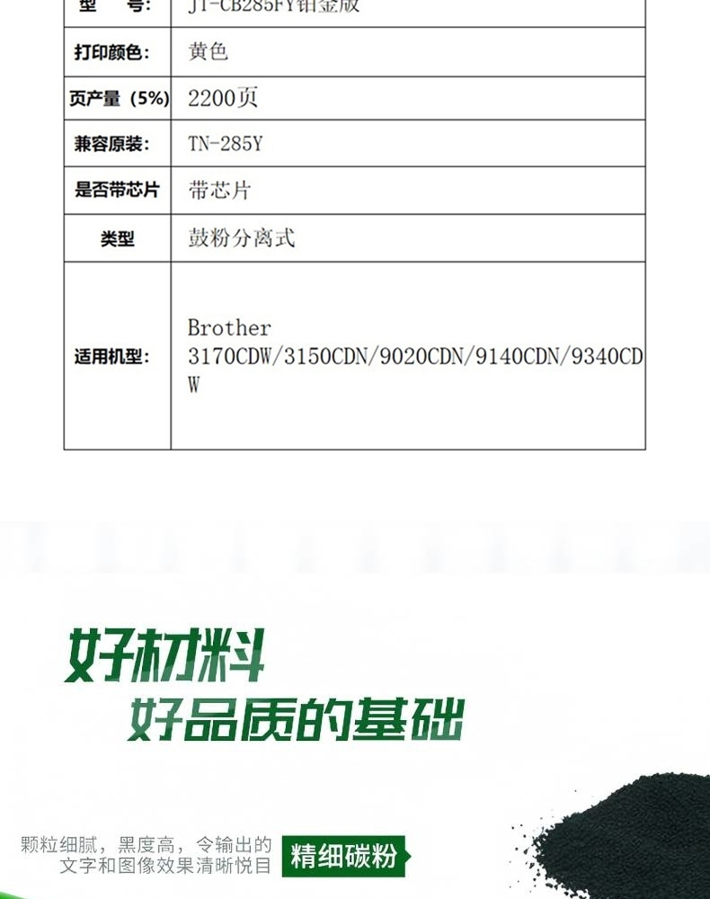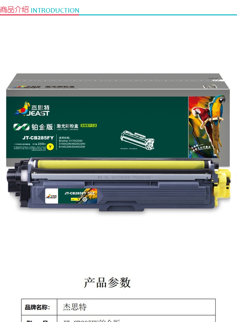 商品属性 [供应商] 科力普科技集团股份有限公司 [打印量] 2200页 [适用机型] Brother 3170CDW/3150CDN/9020CDN/9140CDN/9340CDW [品牌] 杰思特 [型号] JT-CB285FY铂金版