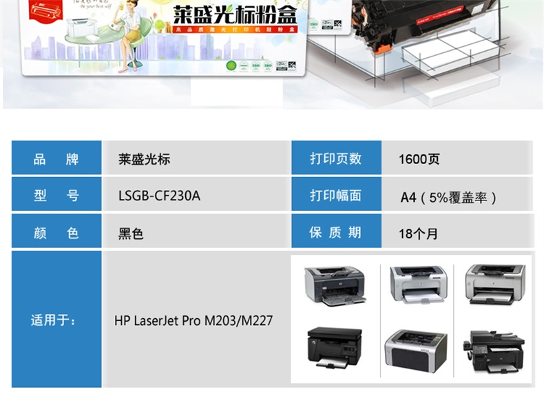 商品属性 [供应商] 科力普科技集团股份有限公司 [打印量] 1600页 [商品毛重] 1kg [适用机型] 适用机型:HP LaserJet Pro M203/M227 [品牌] 莱盛光标 [型号] LSGB-CF230A
