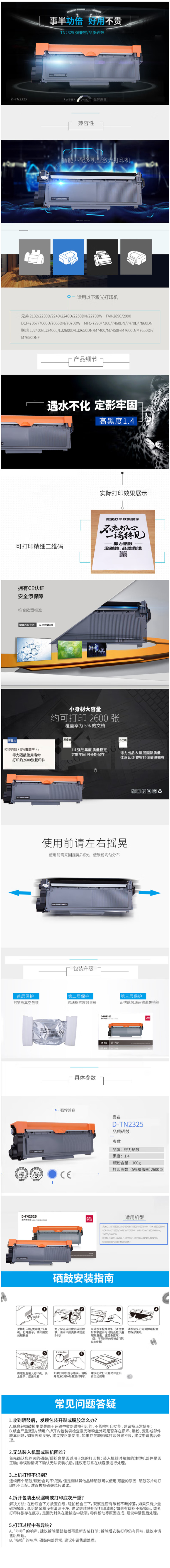 商品属性 [供应商] 得力集团有限公司 [型号] D-TN2325 [打印页数] 2600页 [适用机型] 兄弟2132/2230D/2240/2240D/2250DN/2270DW/FAX-2890/2990/DCP-7057/7060D/7065DN/7070DWMFC-7290/7360/7460DN/7470D/7860DN/联想LJ2400/LJ2400L/LJ2600D/LJ2650DN/M7400/M7450F/M7600D/M7650DF/M7650DNF