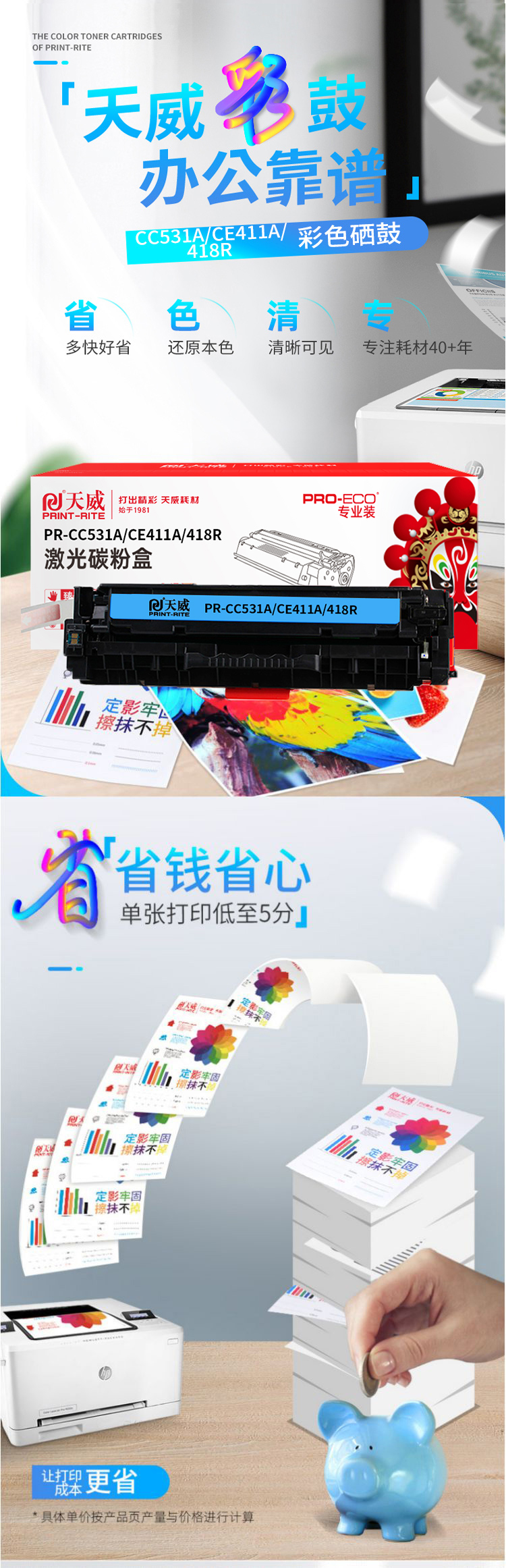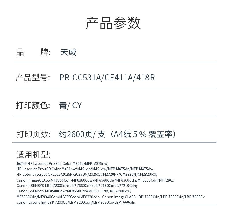 商品属性 [供应商] 得力集团有限公司 [品牌] 天威(PrintRite) [型号] PR-CC531A/CE411A/418R [打印页数] 2600页 [适用机型] 适用于HP LaserJet Pro 300 Color M35la/MFP M375nw;HP LaserJet Pro 400 Color M45lnw/M45ldn/M45ldw/MFP M475dn/MFP M475dw;HP Color LaserJet CP2025/2025N/2025DN/2025X/CM2320NF/CM2320N/CM2320FX1;Canon imageCLASS MF8350Cdn/MF8380Cdw/MF8580Cdw/MF8360Cdn/MF8550Cdn/MF729Cx;Canoni-SENSYS LBP-7200Cdn/LBP 7660Cdn/LBP 7680Cx/LBP7210Cdn;CanonI-SENSYS MF8580Cdw/MF8550Cdn/MF8540Cdn/MF8380Cdw/MF8360Cdn/MF8340Cdn/MF8350cdn/MF8330cdn;Canon imageCLASs LBP-7200Cdn/LBP 7660Cdn/LBP 7680Cx;Canon Laser ShotLBP 7200Cd/LBP 7200Cdn/LBP 7680Cx/LBP7660cdn [打印颜色] 青色