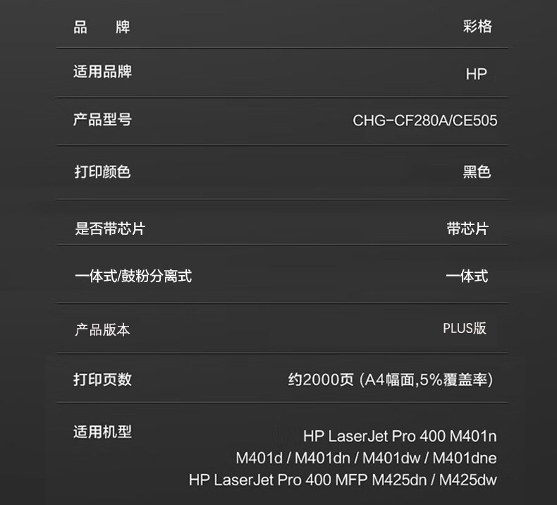 商品属性 [供应商] 科力普科技集团股份有限公司 [适用机型] 适用惠普HP 388a墨盒P1106 P1108 P1007 M126a M1136 M1213nf 1216nfh打印机 [打印量] 2000页 [商品毛重] 1kg [品牌] 彩格 [型号] CHG-CF280A/CE505