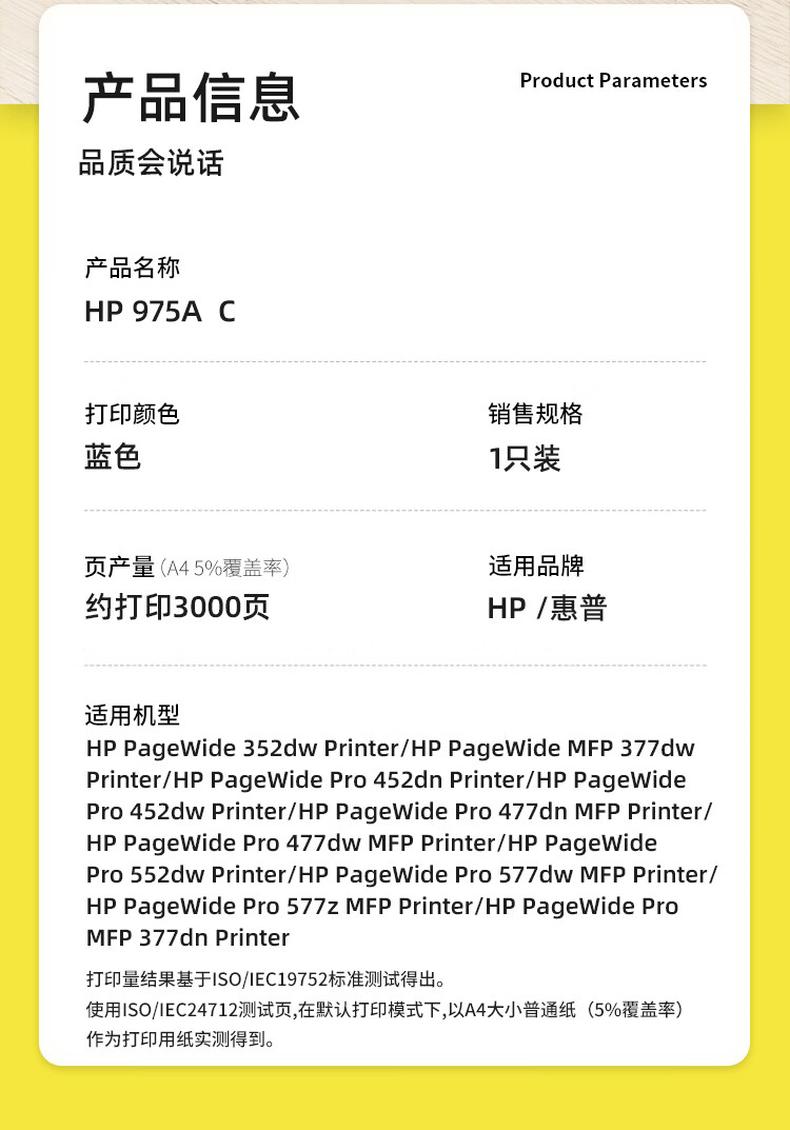 商品属性 [供应商] 得力集团有限公司 [品牌] 科思特 [型号] K 975A C [打印页数] 3000页 [适用机型] HP PageWide 352dw Printer/HP PageWide MFP 377dw Printer/HP PageWide Pro 452dn Printer/HP PageWide Pro 452dw Printer/HP PageWide Pro 477dn MFP Printer/HP PageWide Pro 477dw MFP Printer/HP PageWide Pro 552dw Printer/HP PageWide Pro 577dw MFP Printer/HP PageWide Pro 577z MFP Printer/HP PageWide Pro MFP 377dn Printer