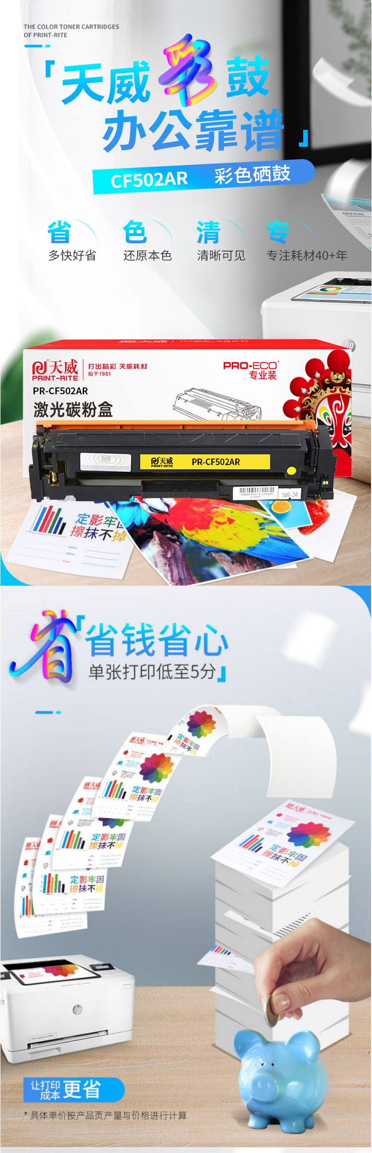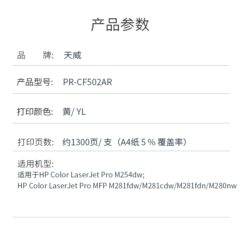 商品属性 [供应商] 得力集团有限公司 [品牌] 天威(PrintRite) [型号] PR-CF502AR [打印页数] 1300页 [适用机型] 适用于HP Color LaserJet Pro M254dw;HP Color LaserJet Pro MFP M281fdw/M28lcdw/M28lfdn/M280nw [打印颜色] 黄色
