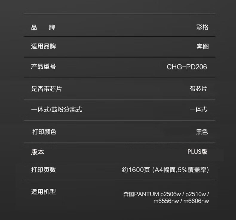 商品属性 [供应商] 科力普科技集团股份有限公司 [商品毛重] 1kg [打印量] 1600页 [适用机型] 适用奔图PANTUM P2510 P2506 P6506 M6556 M6606系列打印机硒鼓碳粉pd206硒鼓碳粉M6506粉盒 [品牌] 彩格 [型号] CHG-PD206