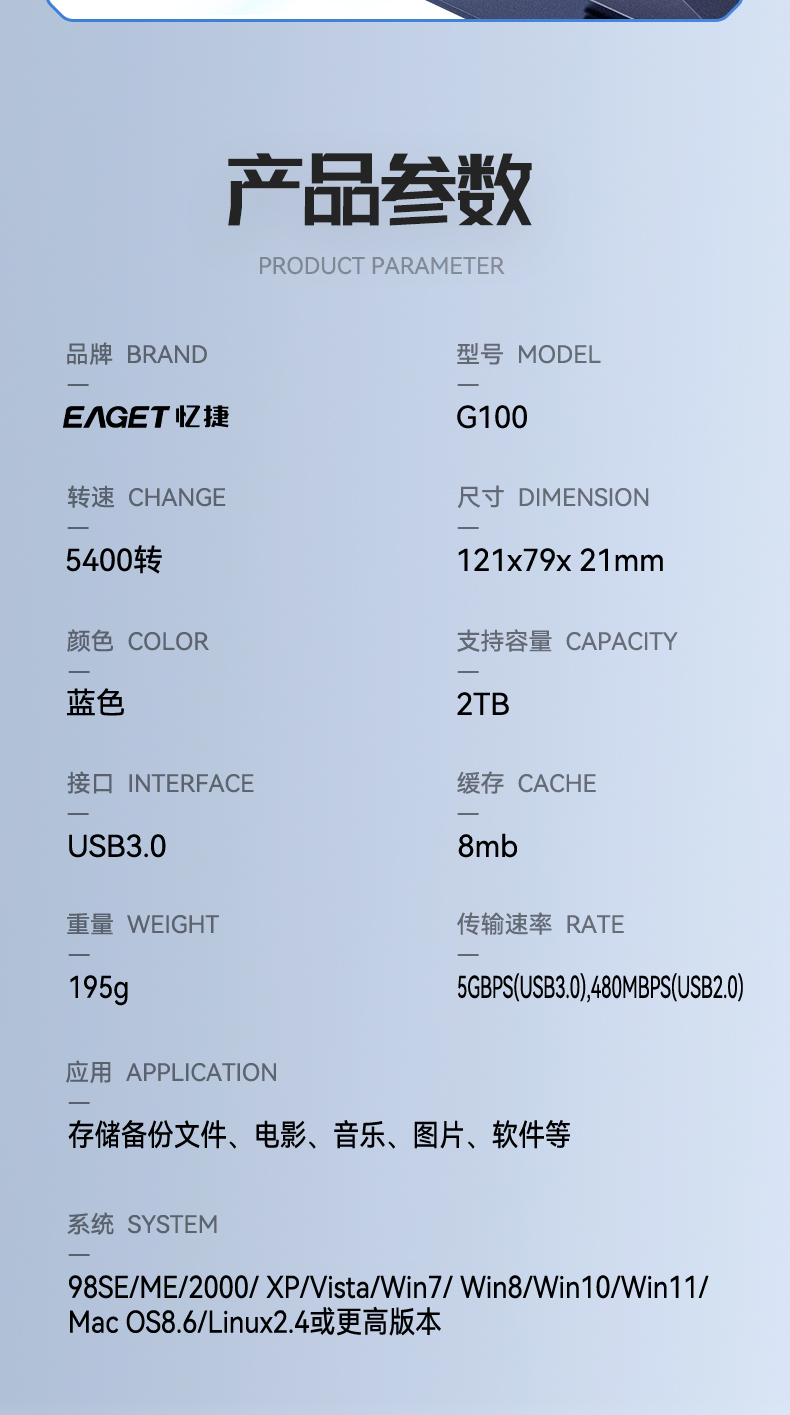 商品属性 [供应商] 深圳市怡亚通供应链股份有限公司 [品牌:] 忆捷(EAGET) [型号:] G100 [规格:] USB3.0 2.5英寸 2TB