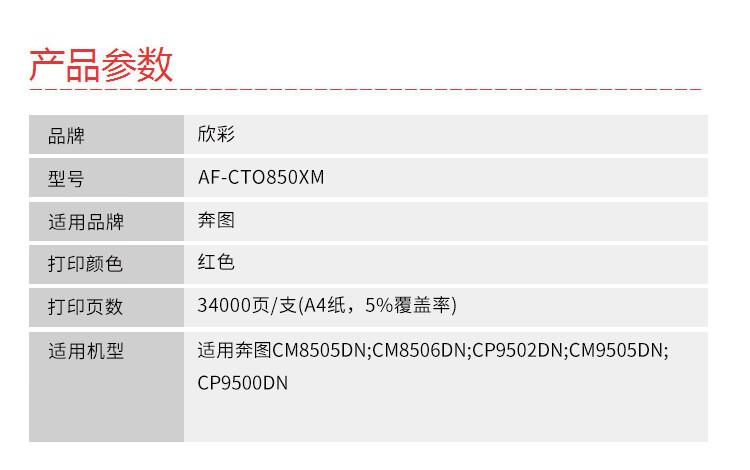 商品属性 [供应商] 苏宁易购集团股份有限公司 [型号] AF-CTO850XM [类型] 硒鼓 [适用机型] 适用奔图CM8505DN [打印量] 34000 [开票单位] 支