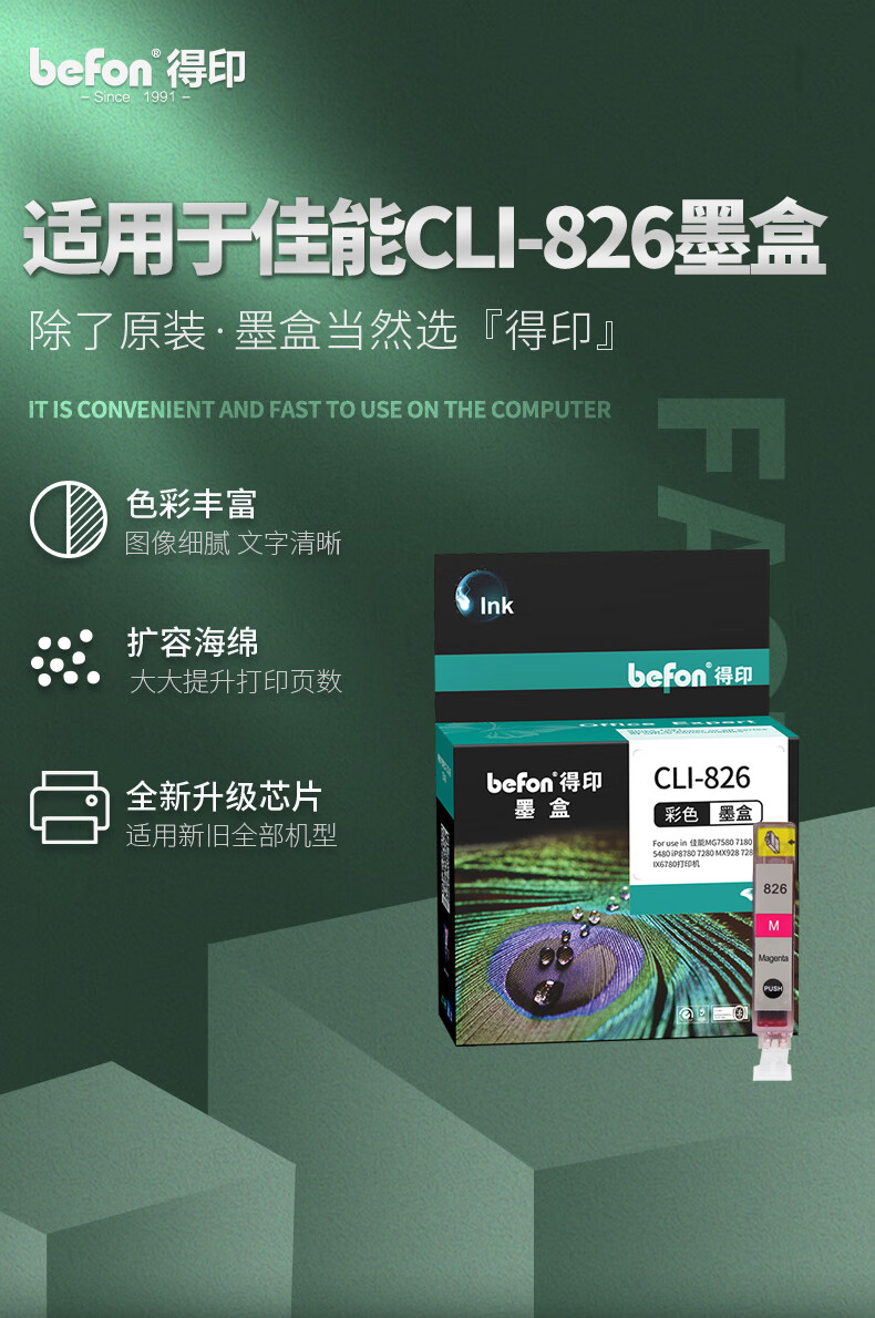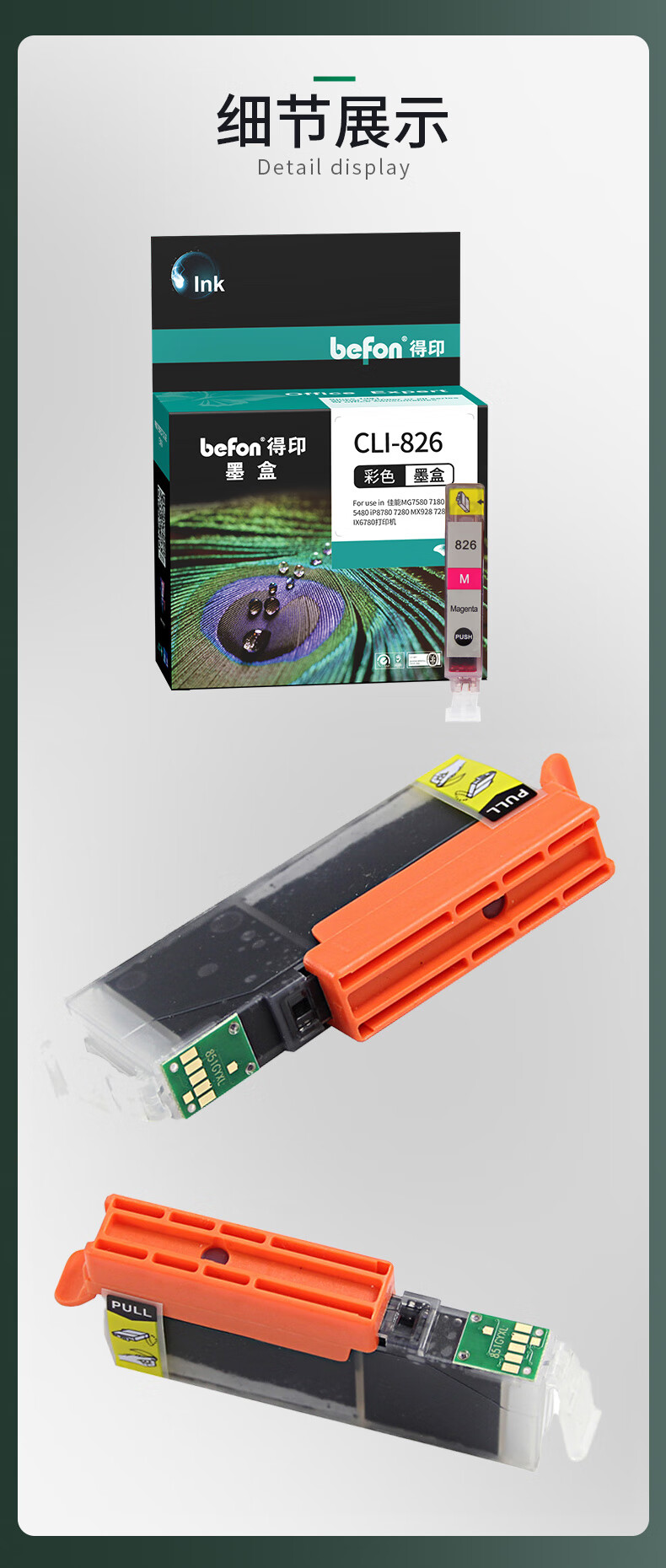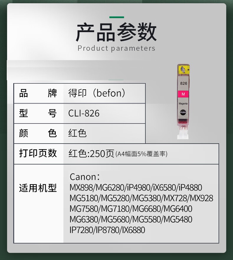 商品属性 [供应商] 深圳市云中鹤科技股份有限公司 [品牌名称:] 得印(befon) [商品型号:] CLI-826 [商品sku编码:] 1125899908260116 [重量:] 0.10kg [产地:] 中国大陆 [单位:] 支