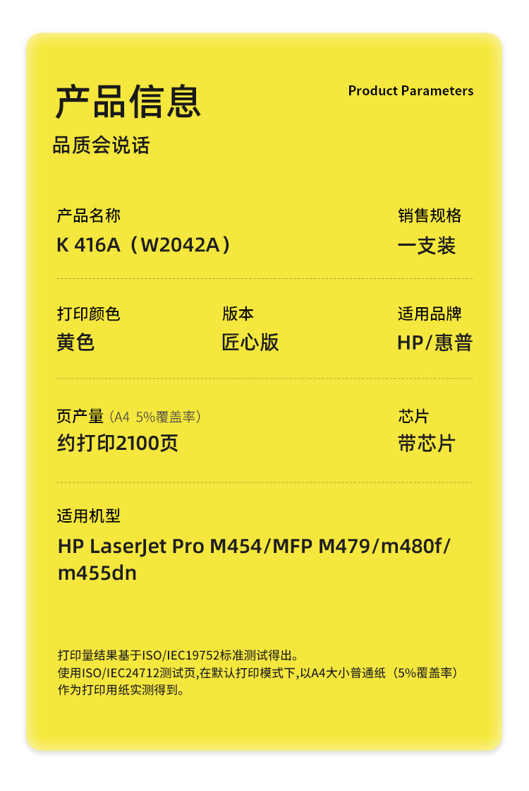 商品属性 [供应商] 得力集团有限公司 [品牌] 科思特 [型号] K 416A(W2042A) [版本] 匠心版 [打印页数] 2100页 [适用机型] HP LaserJet Pro M454/MFP M479/m480f/m455dn [是否带芯片] 带芯片