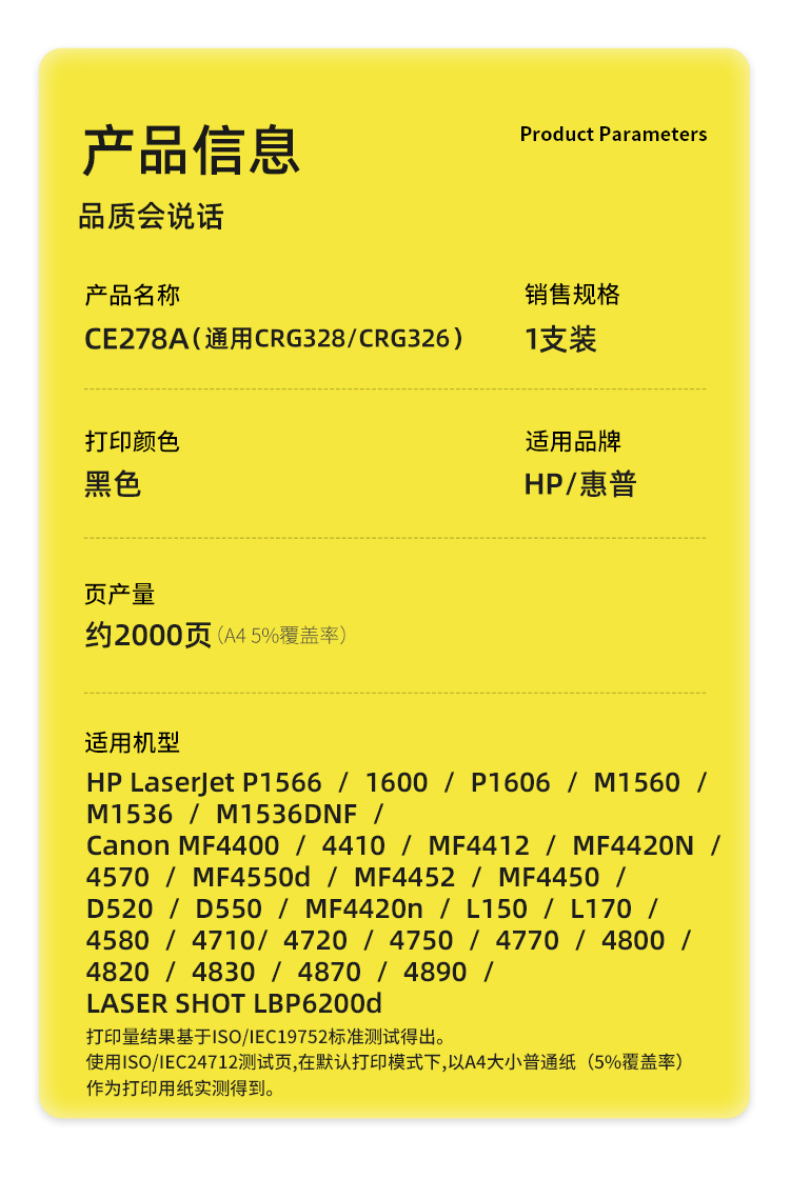 商品属性 [供应商] 科力普科技集团股份有限公司 [适用机型] HP Laseret P1566 /1600 /P1606 /M1560 / M1536 /M1536DNF / Canon MF4400/4410/MF4412 /MF4420N / 4570/MF4550d /MF4452 /MF4450 / D520/D550/MF4420n/L150/L170 / 4580/4710/4720/4750/4770/4800 / 4820/4830/4870/4890 / LASER SHOT LBP6200d [打印量] 2000页 [商品毛重] 1300g [品牌] 科思特 [型号] CE278A