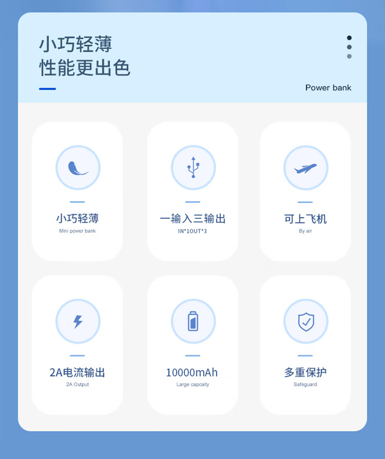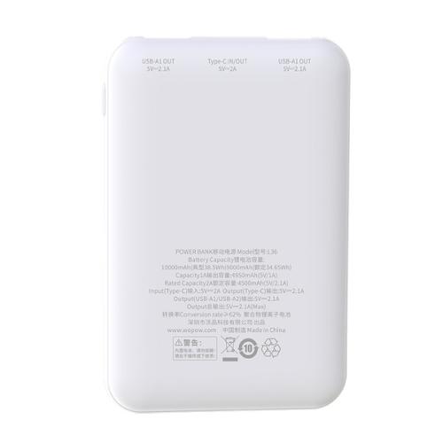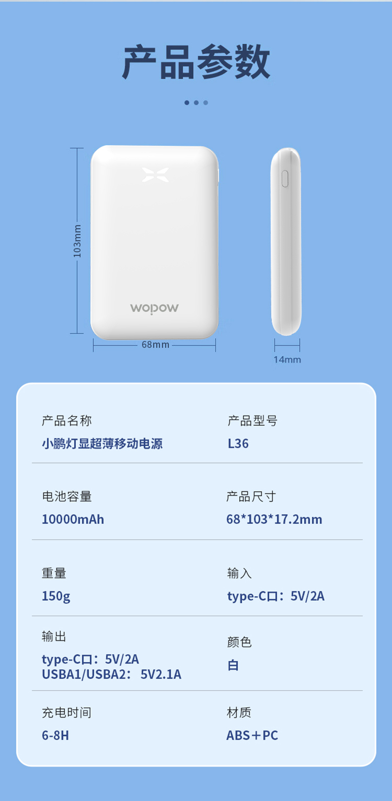 商品属性 [供应商] 苏宁易购集团股份有限公司 [电池容量] 10000mAh [充电时间] 6-8小时 [电芯类型] 聚合物锂离子电芯 [转接头数量] 3个 [LED灯照明] 支持 [是否支持太阳能] 不支持 [USB接口] 3个 [开票单位] 个 [重量] 300克 [尺寸(长×宽×高)] 68*103*17.2毫米 [输出电压/电流] 5伏特/安培 [输入电压/电流] 5伏特/安培 [型号] L36 [适用机型] 全部机型可适用