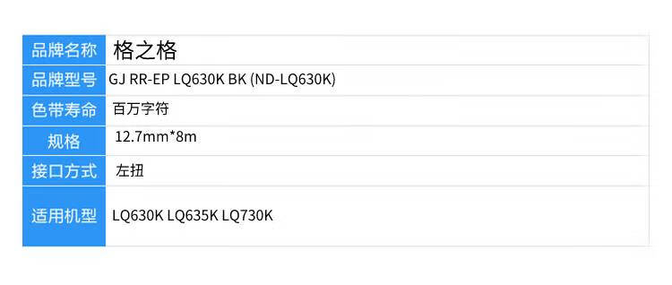 商品属性 [供应商] 北京京东世纪信息技术有限公司 [带芯规格(mmxm)] 12.7mm*8m [带架规格(mmxm)] 12.7mm*8m [型号] GJ RR-EP LQ630K BK (ND-LQ630K) [支数] 1支 [适用机型] LQ630k;LQ635K;LQ730K [接口模式] 左扭