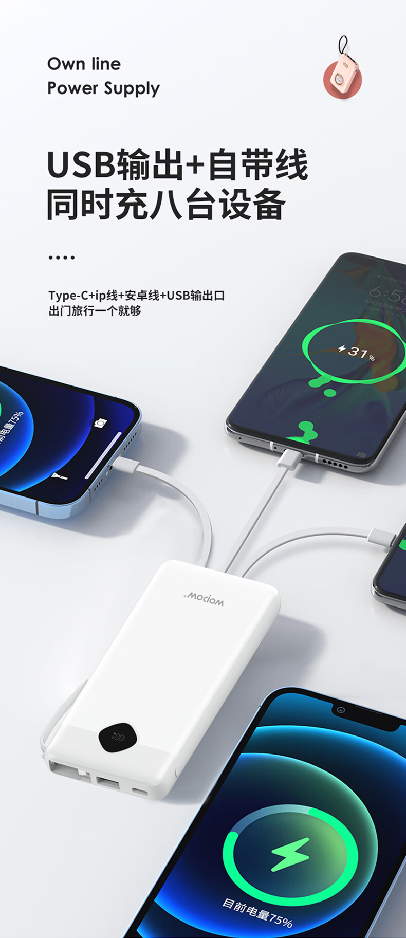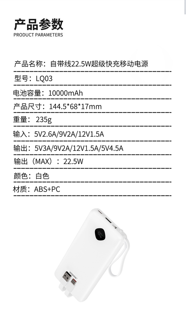 商品属性 [供应商] 苏宁易购集团股份有限公司 [电池容量] 10000mAh [电芯类型] 聚合物锂离子电芯 [LED灯照明] 不支持 [是否支持太阳能] 不支持 [USB接口] 2个 [开票单位] 个 [重量] 235克 [尺寸(长×宽×高)] 144.5*68*17毫米 [输出电压/电流] 5伏特/安培 [输入电压/电流] 5伏特/安培 [型号] LQ03 [适用机型] 全部机型可适用