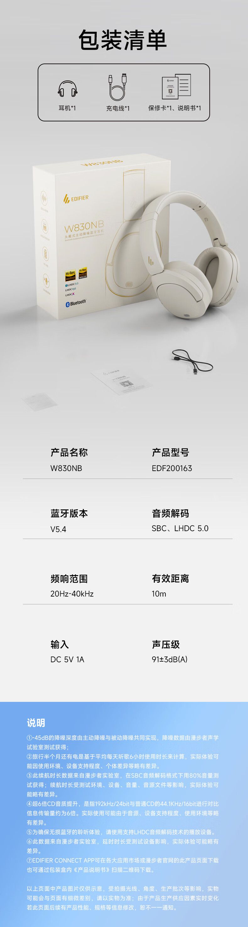 商品属性 [供应商] 深圳市怡亚通供应链股份有限公司 [品牌:] 漫步者(EDIFIER) [型号:] W830NB EDF200163 [规格:] 蓝牙5.4 有效距离10m