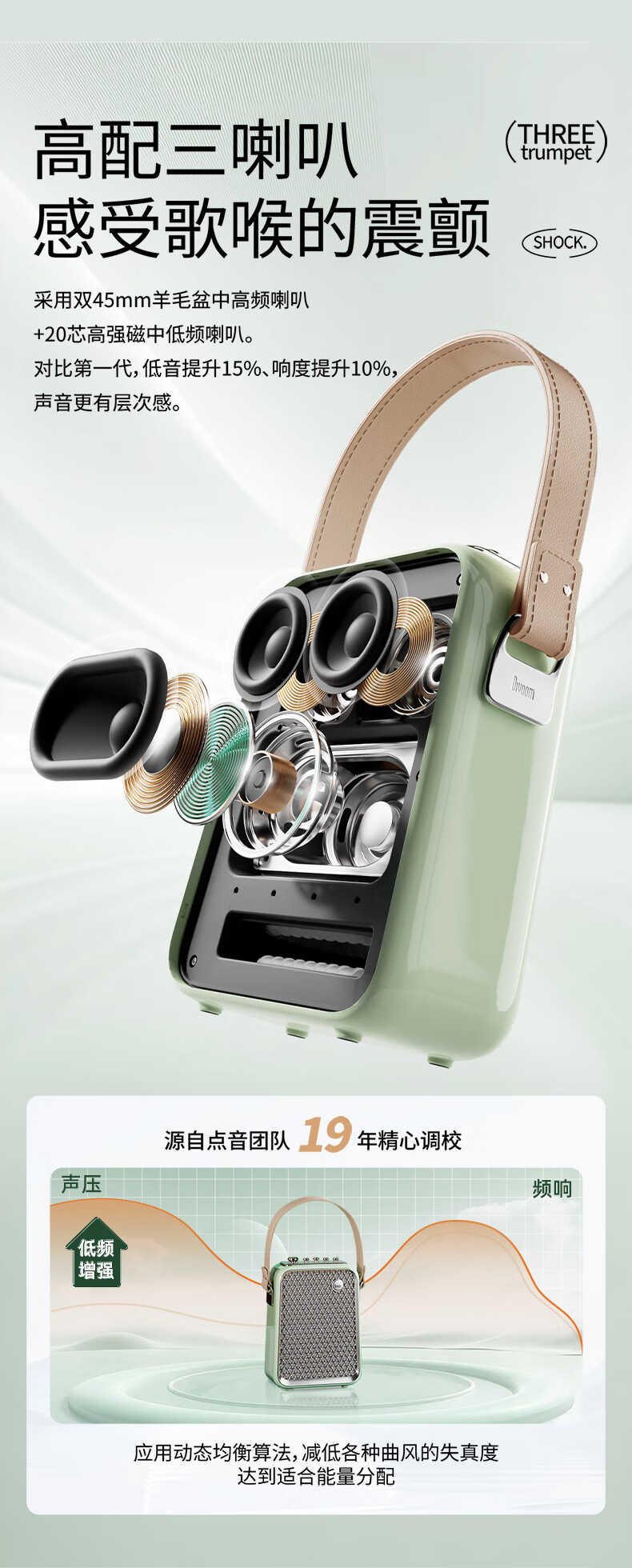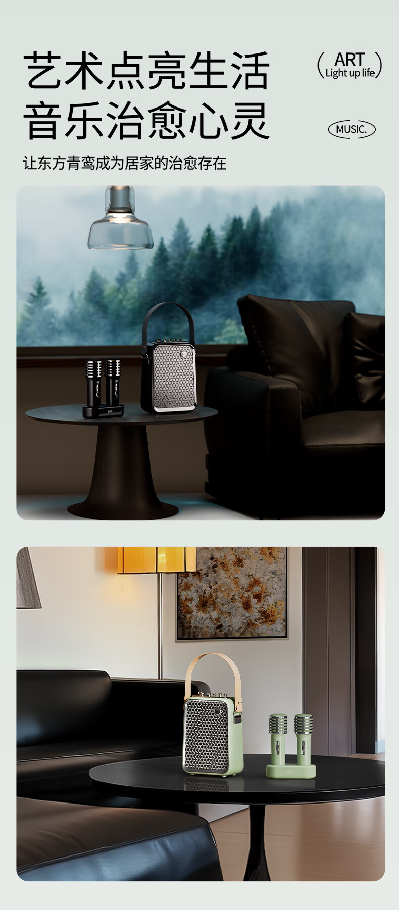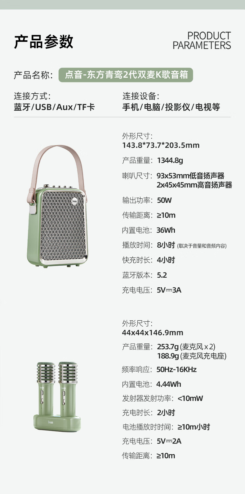 商品属性 [供应商] 得力集团有限公司 [品牌] Divoom点音 [型号] SongBird-HQ-2 [商品标题] Divoom点音 SongBird-HQ-2 蓝牙音箱家庭KTV音响带双麦克风 户外便携无线唱歌话筒音响 东方青鸾 (单位:套) [销售单位] 套