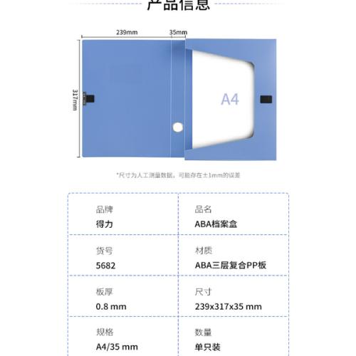 商品属性 [供应商] 得力集团有限公司 [品牌] 得力 [型号] 5682 [商品标题] 得力 5682 PP档案盒236×318×35mm (单位:只) 蓝色粘扣 [销售单位] 只