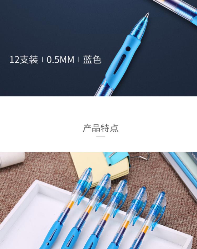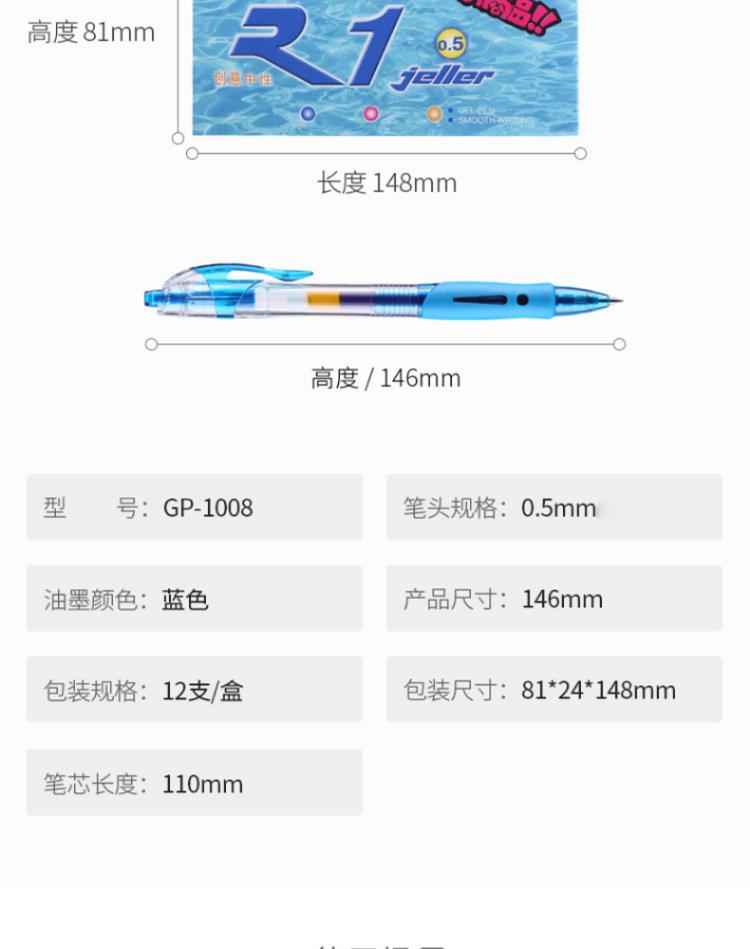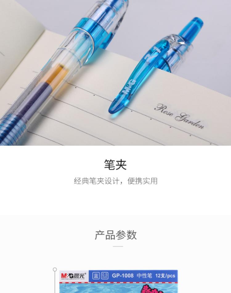 商品属性 [供应商] 深圳齐心集团股份有限公司 [适用替芯] 笔芯型号 [笔芯颜色] 蓝色 [打开方式] 按压式 [笔尖粗细] 0.5mm [入数] 12支 [品牌] 晨光 [型号] GP-1008 [内包装] 12支/盒