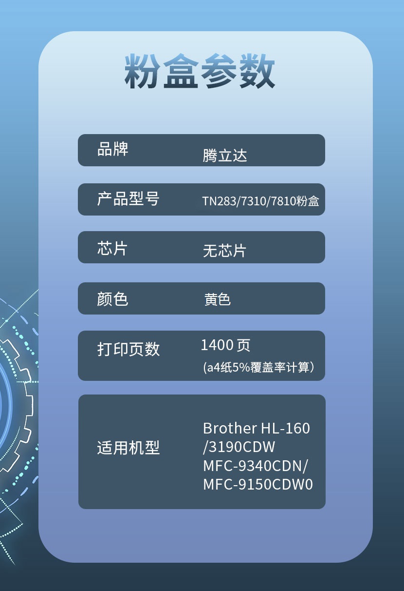 商品属性 [供应商] 得力集团有限公司 [品牌] 腾立达 [型号] TN283 /7310/7810 [商品标题] 腾立达TN283 /7310/7810粉盒 黄色 适用:兄弟HL-3160/3190/DCP-9030CDN/MFC-9150CDN(单位:个) [销售单位] 个