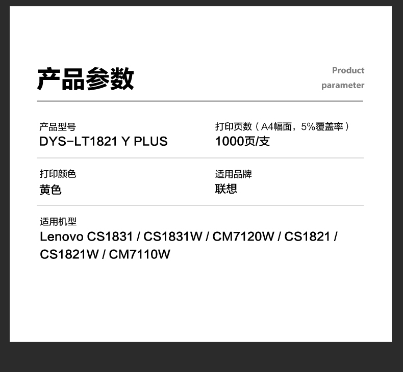商品属性 [供应商] 德致商成集团有限公司 [是否带芯片] 带芯片 [打印页数] 1000页 [国产/进口] 国产 [支数] 1支 [商品产地] 中国大陆 [适用机型] 适用联想LT1821Y CS1831/CS1831W/CM7120W/CS1821/CS1821W/CM7112W