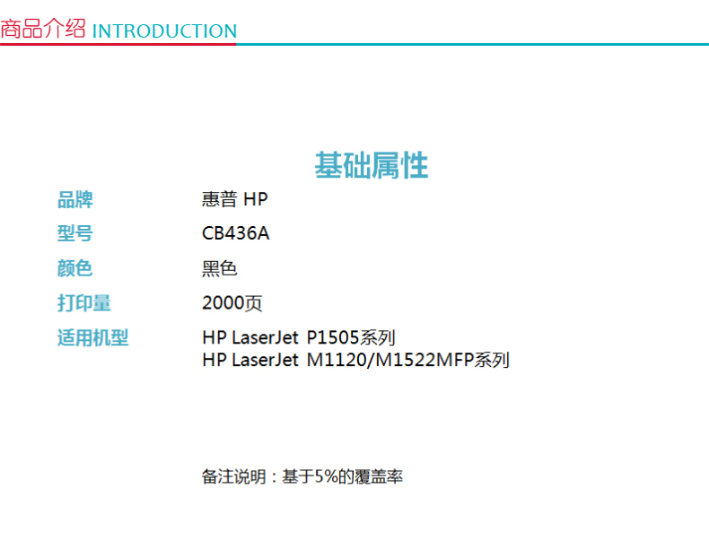 商品属性 [供应商] 科力普科技集团股份有限公司 [打印量] 2000页 [适用机型] HP LaserJet P1505打印机系列 LaserJet M1120/M1522MFP系列 [产地] 中国 [品牌] 惠普 [型号] CB436A