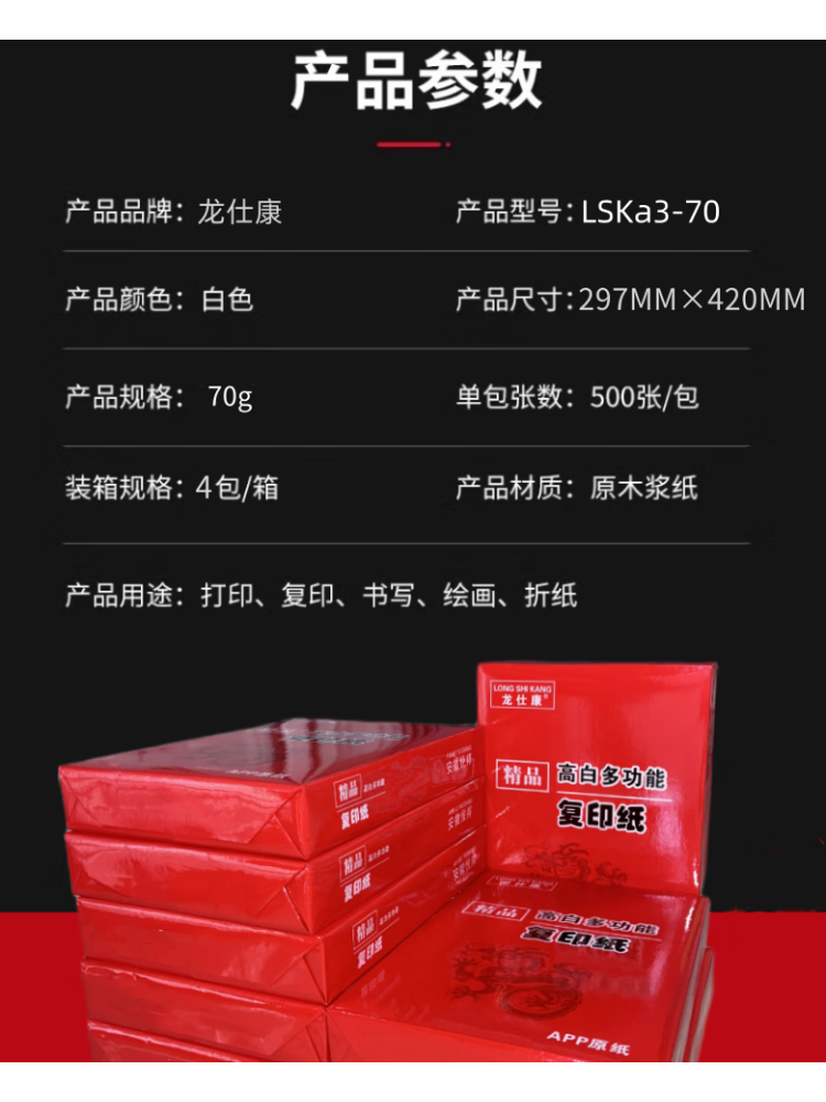 商品属性 [供应商] 深圳市怡亚通供应链股份有限公司 [品牌:] 龙仕康 [型号:] LSKa3-70 [规格:] 70G 500张/包 4包