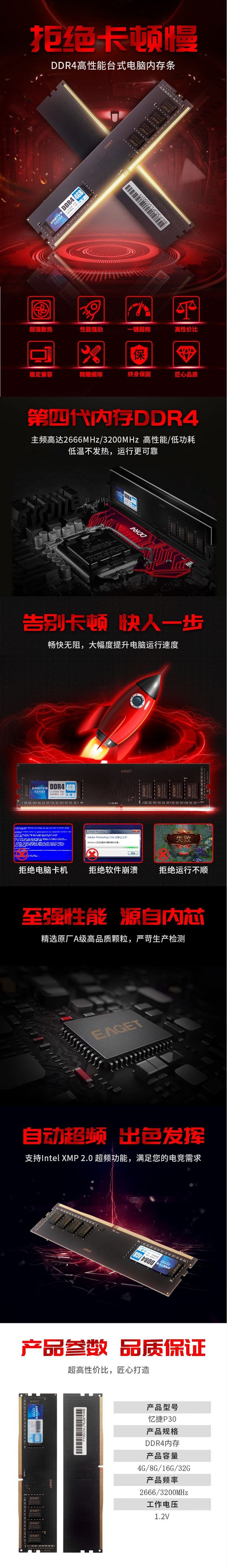 商品属性 [供应商] 全程速达科技有限公司 [名称] 内容 [品牌:] 忆捷(EAGET) [商品名称:] DDR4台式机内存 [型号:] P30