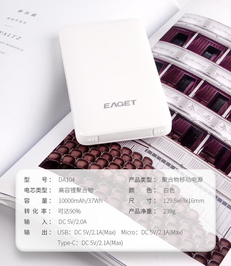商品属性 [供应商] 北京京东世纪信息技术有限公司 [型号产品型号] DA104 [电池容量] 10000mAh [类型] 充电宝