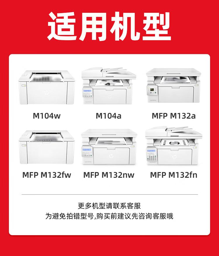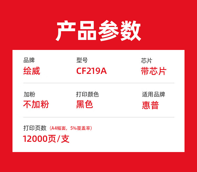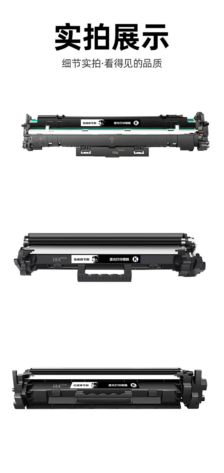 商品属性 [供应商] 苏宁易购集团股份有限公司 [型号] CF219A [类型] 硒鼓 [系列] 一体式硒鼓 [适用机型] 适用惠普HP m132nw m132snw打印机硒鼓 M104a M104w M132a M132fn/fp/fw 19a硒鼓 [使用温度] 10-30° [尺寸(长×宽×高)] 345*120*170 [重量] 3.1千克 [打印量] 12000 [保质期] 2年 [产品特色] 一体式硒鼓 清晰 黑度稳定 遇水不化 [开票单位] 支