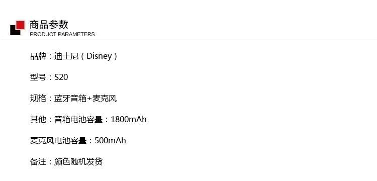 商品属性 [供应商] 深圳齐心集团股份有限公司 [品牌] 迪士尼(Disney) [型号] S20 [音箱电池容量] 1800mAh [麦克风电池容量] 500mAh