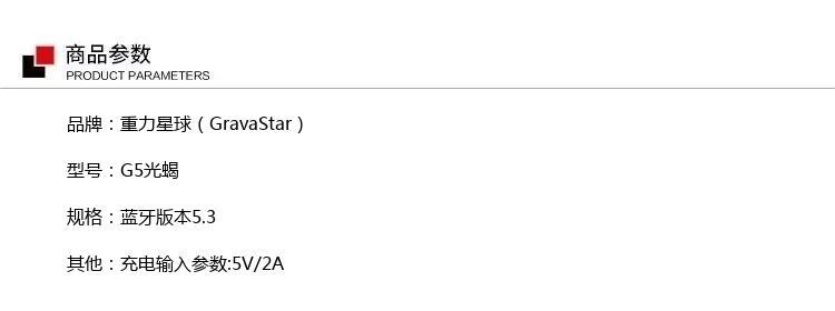 商品属性 [供应商] 深圳齐心集团股份有限公司 [品牌] 重力星球(GravaStar) [型号] G5光蝎 [充电输入参数] 5V/2A