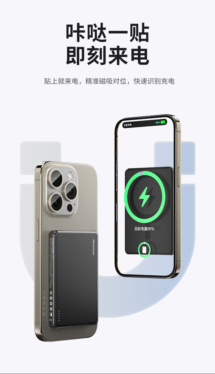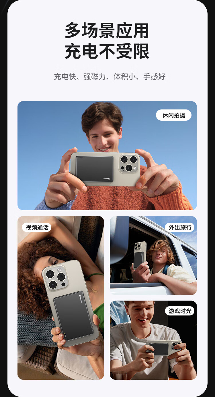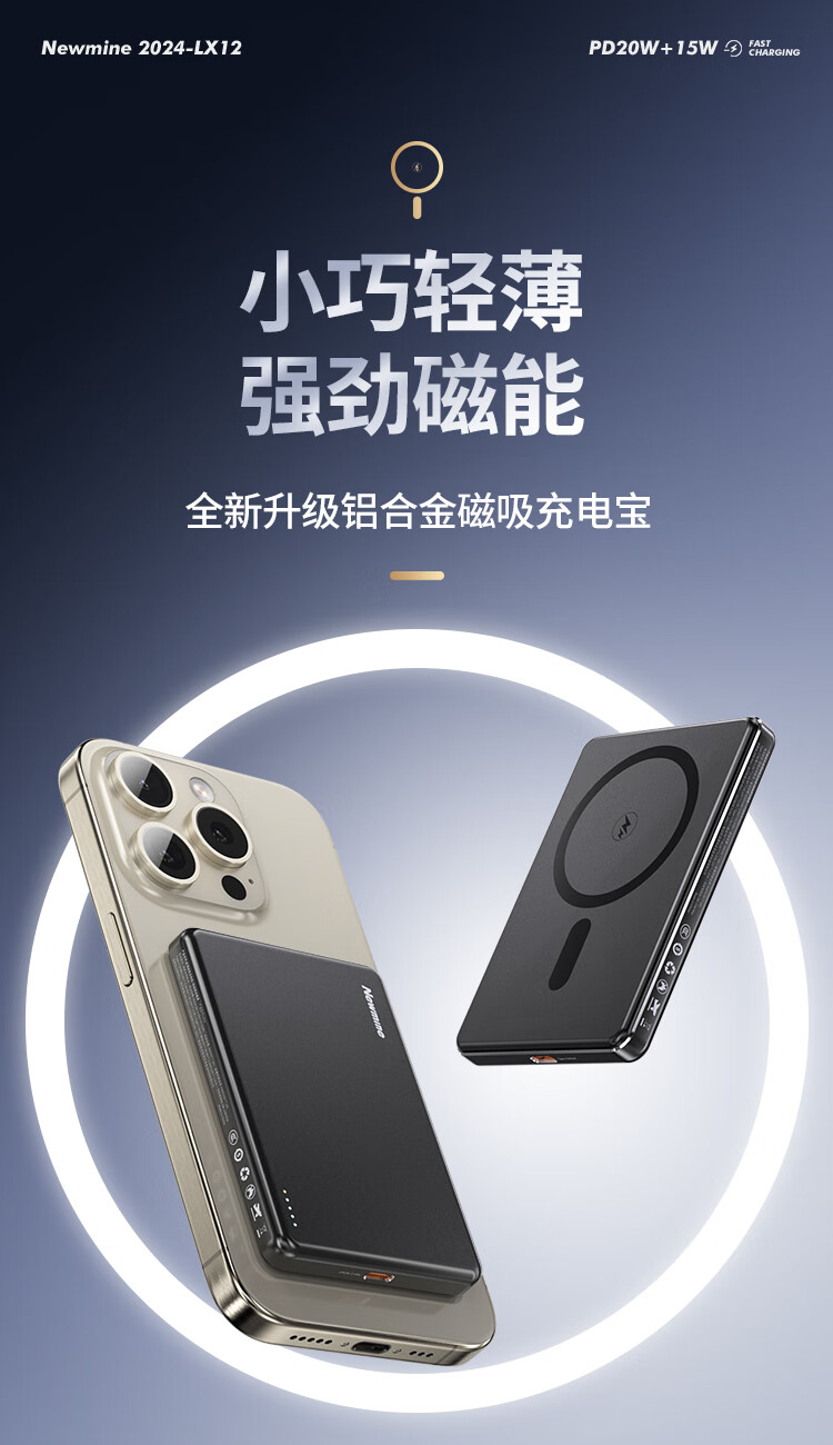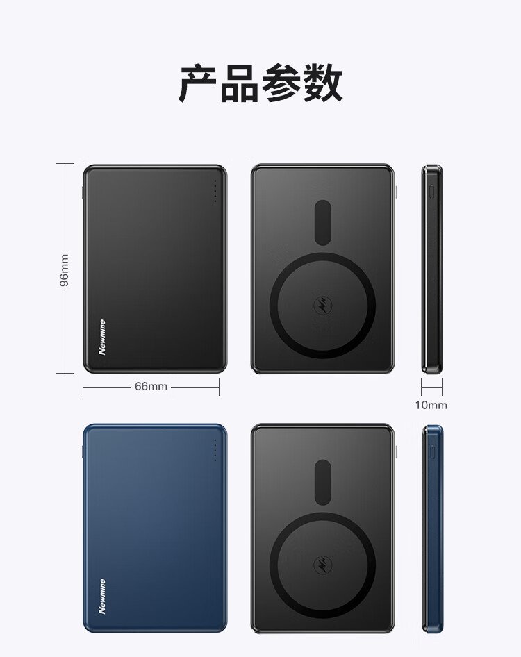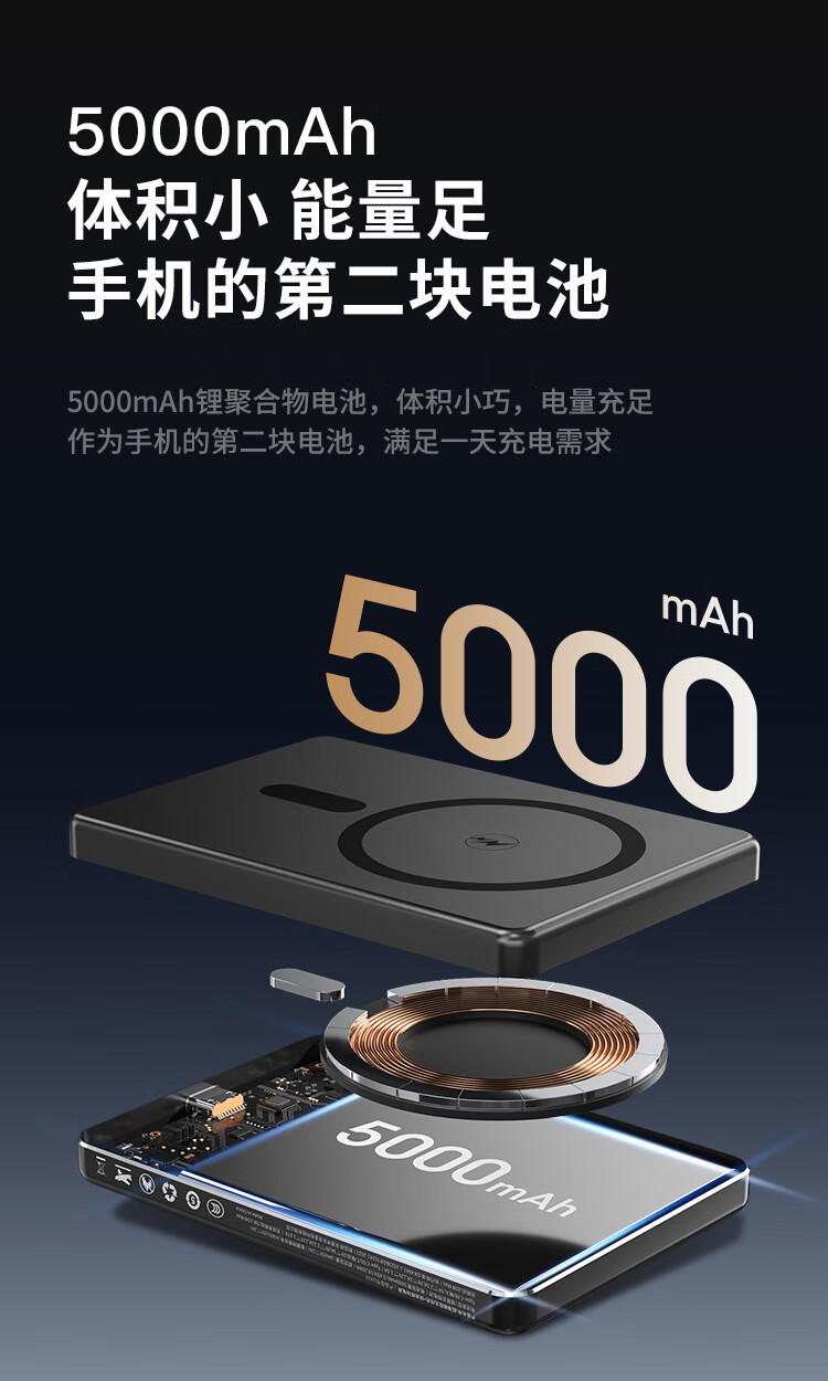 商品属性 [供应商] 苏宁易购集团股份有限公司 [电池容量] 5000mAh [充电方式] 磁吸 [电芯类型] 聚合物锂离子电芯 [LED灯照明] 不支持 [是否支持太阳能] 不支持 [USB接口] 1个 [重量] 118克 [尺寸(长×宽×高)] 96*66*10毫米 [型号] LX12 [适用机型] 通用