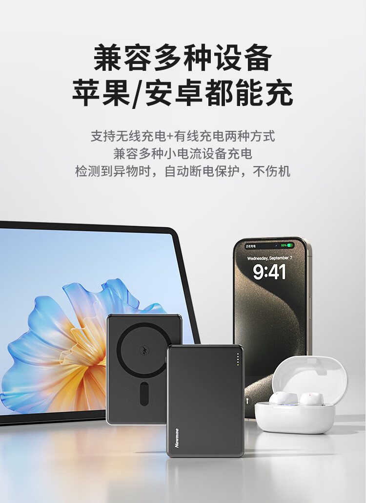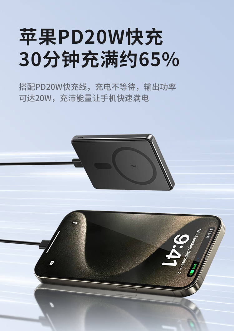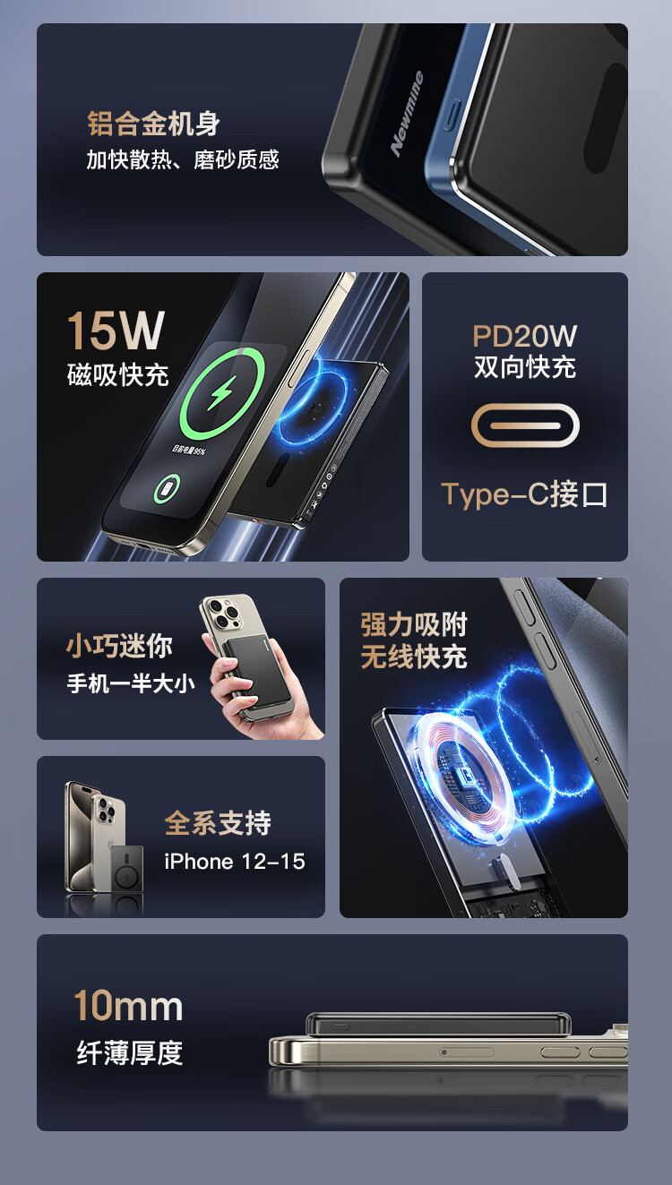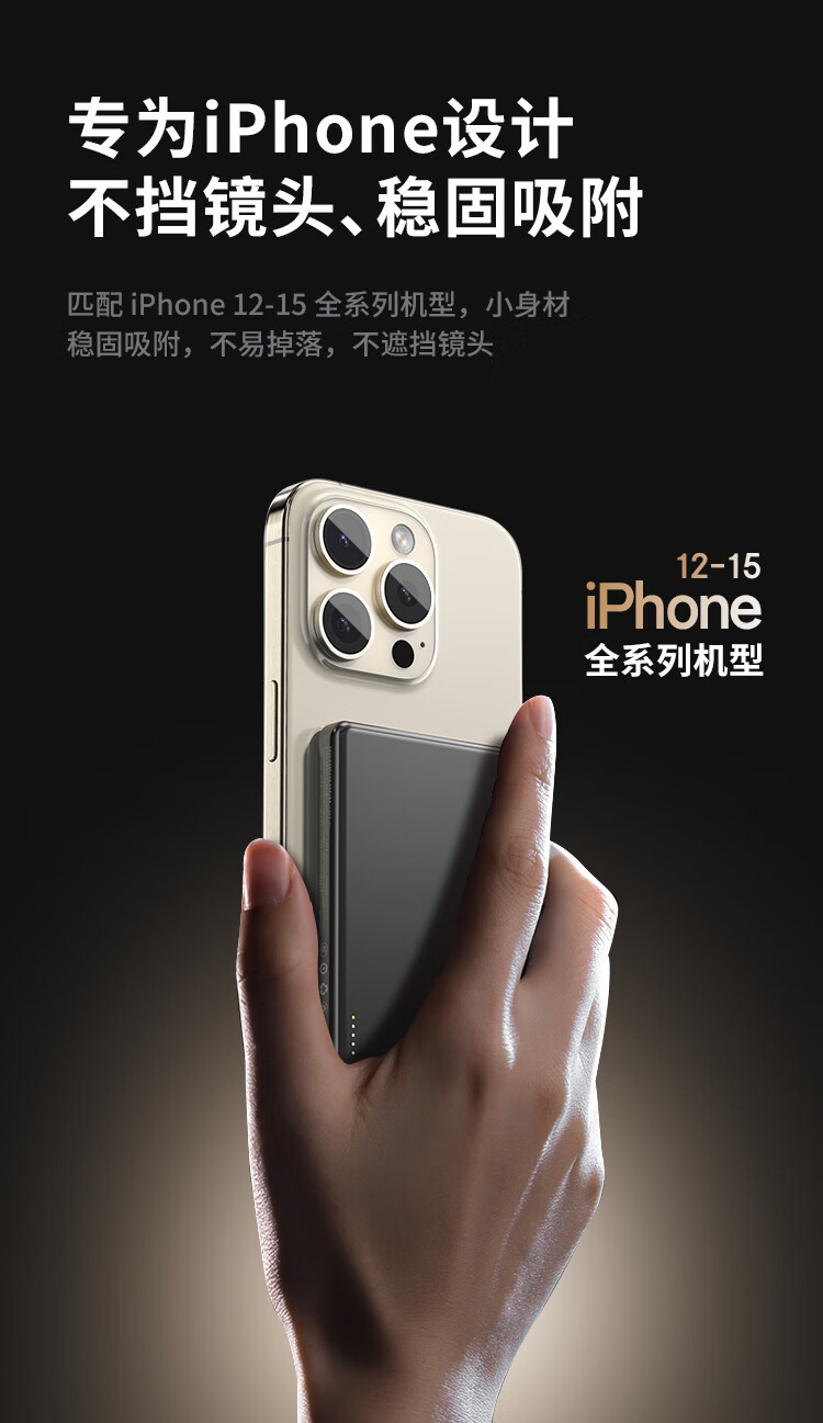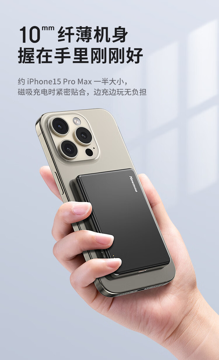 商品属性 [供应商] 苏宁易购集团股份有限公司 [电池容量] 5000mAh [充电方式] 磁吸 [电芯类型] 聚合物锂离子电芯 [LED灯照明] 不支持 [是否支持太阳能] 不支持 [USB接口] 1个 [重量] 118克 [尺寸(长×宽×高)] 96*66*10毫米 [型号] LX12 [适用机型] 通用