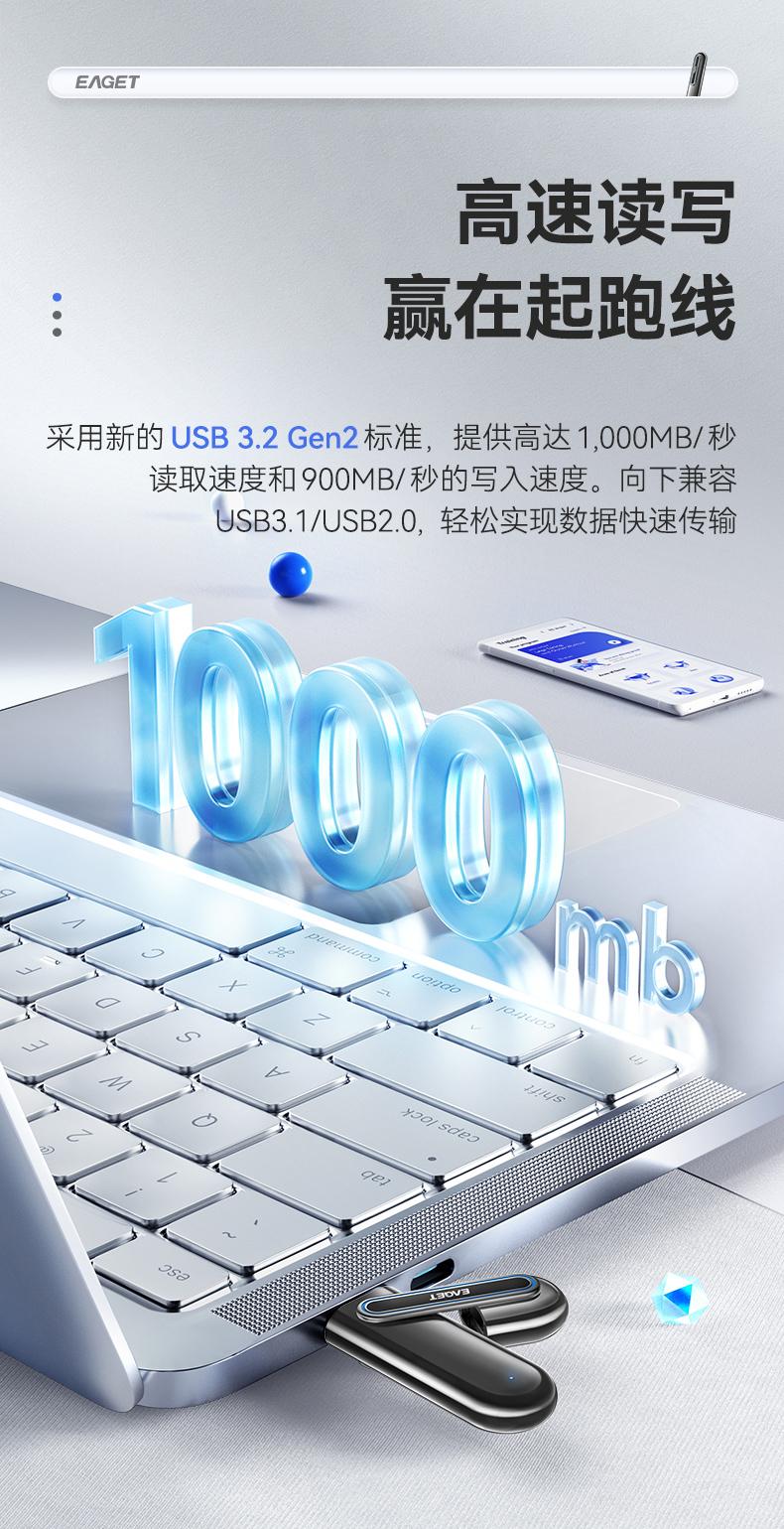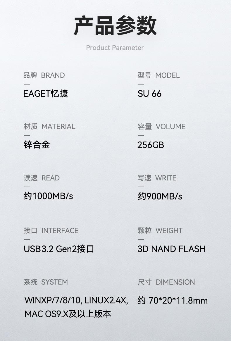 商品属性 [供应商] 深圳市怡亚通供应链股份有限公司 [品牌:] 忆捷(EAGET) [型号:] SU66 [规格:] USB3.2 Gen2接口 256G