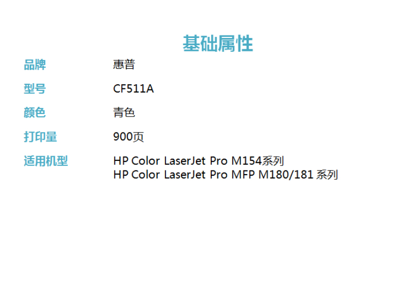 商品属性 [供应商] 科力普科技集团股份有限公司 [适用机型] HP M154系列;M180/M181系列 [打印量] 900页 [产地] 中国 [品牌] 惠普 [型号] CF511A