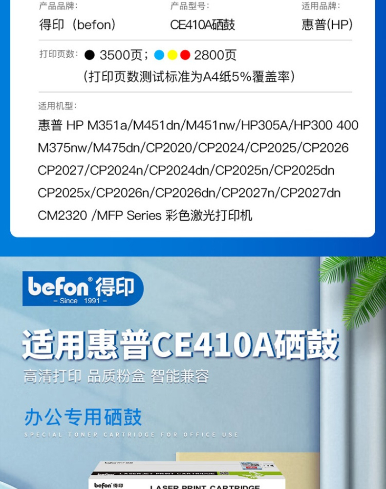 商品属性 [供应商] 科力普科技集团股份有限公司 [适用机型] НР M351а/M451dn/M451nw/HP305A/HP300 400 M375nw/M475dn/CP2020/CP2024/CP2025/CP2026 CP2027/CP2024n/CP2024dn/CP2025n/CP2025dn CP2025x/CP2026n/CP2026dn/CP2027n/CP2027dn CM2320/MFPSeries彩色激光打印机 [商品毛重] / [打印量] 11900页 [品牌] 得印