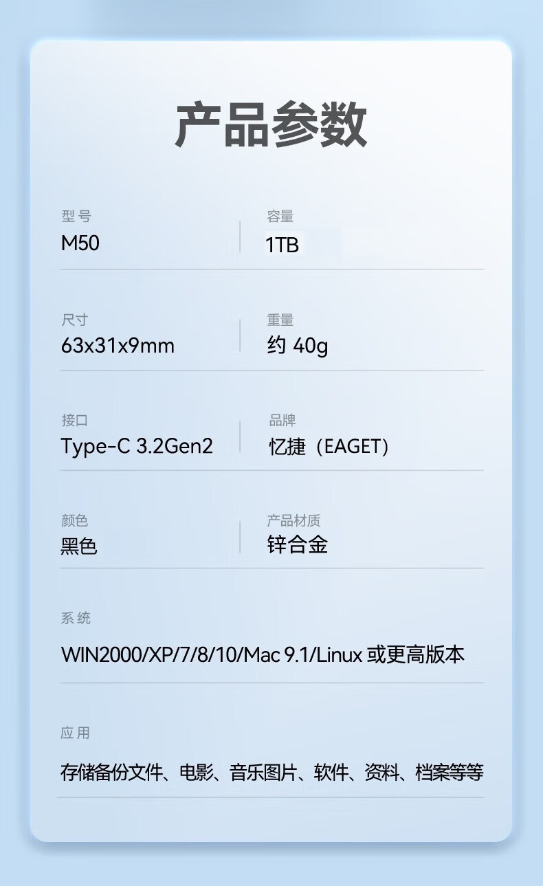 商品属性 [供应商] 北京京东世纪信息技术有限公司 [产品尺寸] 长63mm;宽31mm;高9mm [型号] M50 [最高连续读速] 1140MB/s [系统] Windows XP;Windows 7