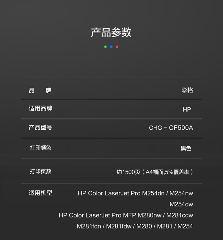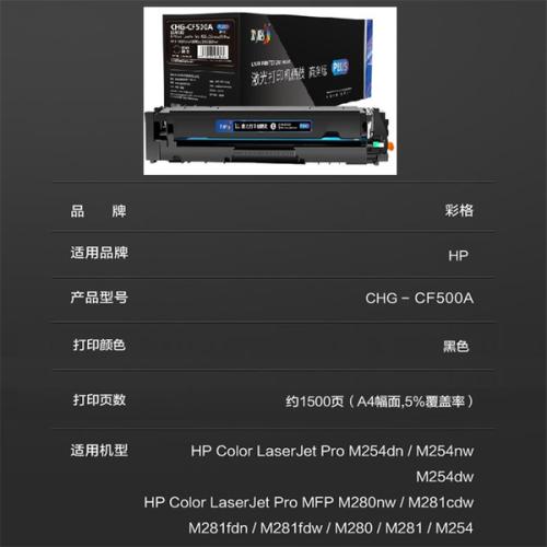 商品属性 [供应商] 得力集团有限公司 [品牌] 彩格(CHGC) [型号] CHG-CF500A [商品标题] 彩格PLUS CF500A 黑色单支装 (适用惠普HP/m254dn/m254dw/m254nw/m280nw/m281cdw/m281fdn/m281fdw) 1500页(单位:支) [销售单位] 支